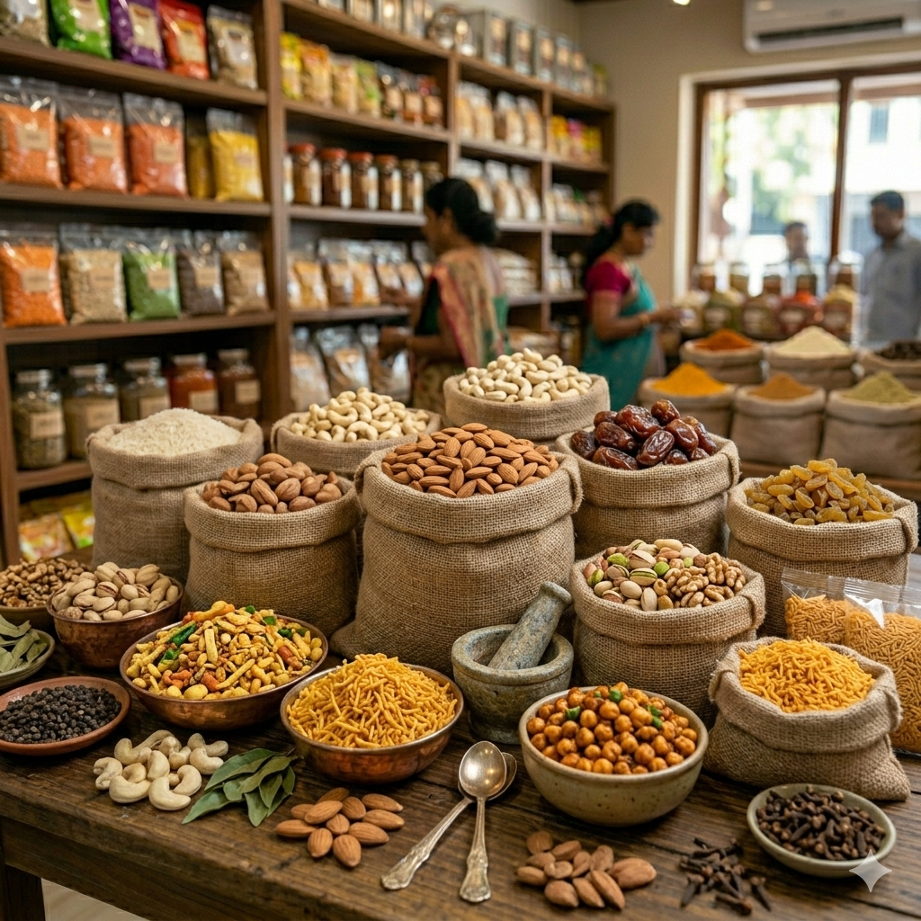 We offer basmati rice, dal varieties, spices and masalas, dry fruits, dairy products, fresh vegetables, frozen foods, namkeen, household essentials, and more β all under one roof.